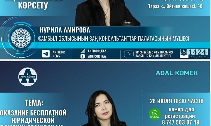 28 июля т.г. в 16:30 часов член Палаты юридических консультантов Жамбылской области Нурила Амирова окажет гражданам бесплатную юридическую помощь.