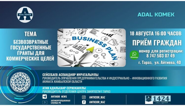В рамках проекта «Адал көмек» 18 августа текущего года в 16:00 часов руководитель управления предпринимательства и индустриально-инновационного развития акимата Жамбылской области Аспандияр Сейсебаев и руководитель отдела центра занятости акимата города Тараза Адильхаир Атин ответят на вопросы жамбылцев относительно безвозвратных грантов для коммерческих целей в пределах компетенции вышеуказанных ведомств.