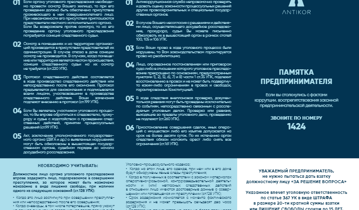 Агентством по противодействию коррупции подготовлена Памятка предпринимателя.