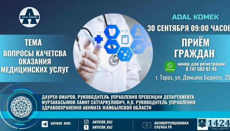 30 сентября т.г. с 09:00 до 11:00 часов и.о. руководителя Управления здравоохранения акимата Жамбылской области Хамит Мырзакасымов и руководитель Управления превенции Департамента Агенства РК по противодействию коррупции по Жамбылской области Даурен Омаров и проведут прием граждан в городской поликлинике №6 с жителями города по адресу: г. Тараз, ул. Демьяно Бедного, 35.