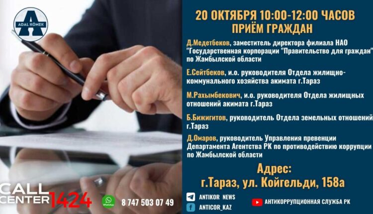 20 октября т.г. с 10.00 до 12.00 часов впервые в отделении ЦОНа города Тараз по улице Койгельди 158 а состоится масштабный прием граждан по вопросам сферы земельных, жилищных отношений, а также жилищно-коммунального хозяйства, пассажирского транспорта и автомобильных дорог.