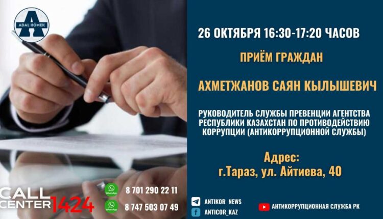 26 октября т. г. в рамках проекта «Adal komek» руководитель службы превенции Агентства РК по противодействию коррупции (Антикоррупционной службы) Ахметжанов Саян Кылышевич проведет личный прием граждан.