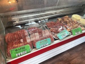 В ассортименте мясного павильона имеются: говяжья грудинка – 2200 тенге, рагу из говядины – 1900 тенге, баранина – 2400 тенге, филе говядины – 3100 тенге, корейка – 2300 тенге, фарш говяжий с жиром – 2200 тенге, фарш говяжий без жира – 2200 тенге, гуляш из говядины – 2700 тенге и другое.