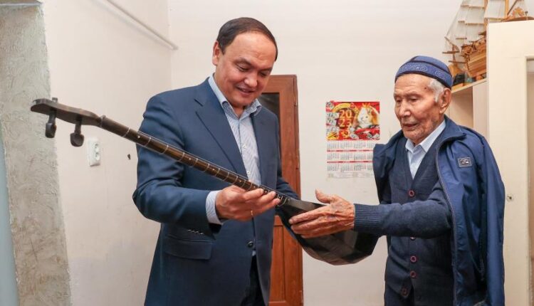 В ходе рабочей поездки в Шуский район аким Жамбылской области Ербол Карашукеев встретился с известным кюйши-композитором, Заслуженным деятелем культуры РК Абдимомыном Желдибаевым.