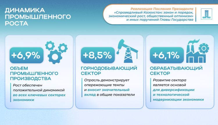 Ключевой задачей, поставленной Главой государства, является построение сильной и диверсифицированной экономики. Итоги 7 месяцев 2025 года свидетельствуют о положительной динамике в промышленном секторе, который является локомотивом национального развития. Объем промышленного производства продемонстрировал уверенный рост на 6,9%. Драйверами роста стали как горнодобывающая промышленность, увеличившая объемы на 8,5%, так и, что особенно важно для диверсификации, обрабатывающий сектор, показавший рост на 6,1%.