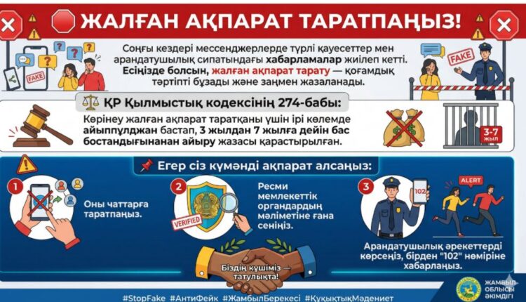 ⚖️ Статья 274 Уголовного кодекса Республики Казахстан: за распространение заведомо ложной информации предусмотрено наказание — от крупного штрафа до лишения свободы на срок от 3 до 7 лет.