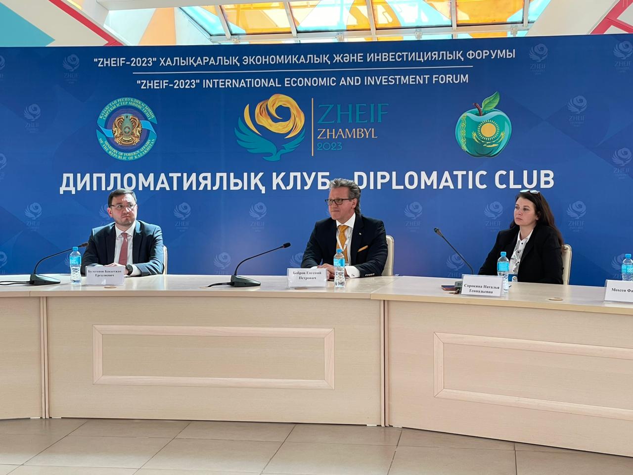 – Два дня мы участвуем в замечательном форуме ZHEIF-2023, хочу отметить, что в составе клуба около 26 дипломатов из разных стран, им продемонстрированы потенциальные возможности Жамбылской области по инвестиционным направлениям. При содействии председателя правления акционерного общества «Социально-предпринимательская корпорация «Тараз» Даулета Абилкаирова и акимата региона провели выездной дипломатический клуб, который, повторюсь, создаст новые благоприятные возможности для сотрудничества в различных отраслях экономики, – сказал он.