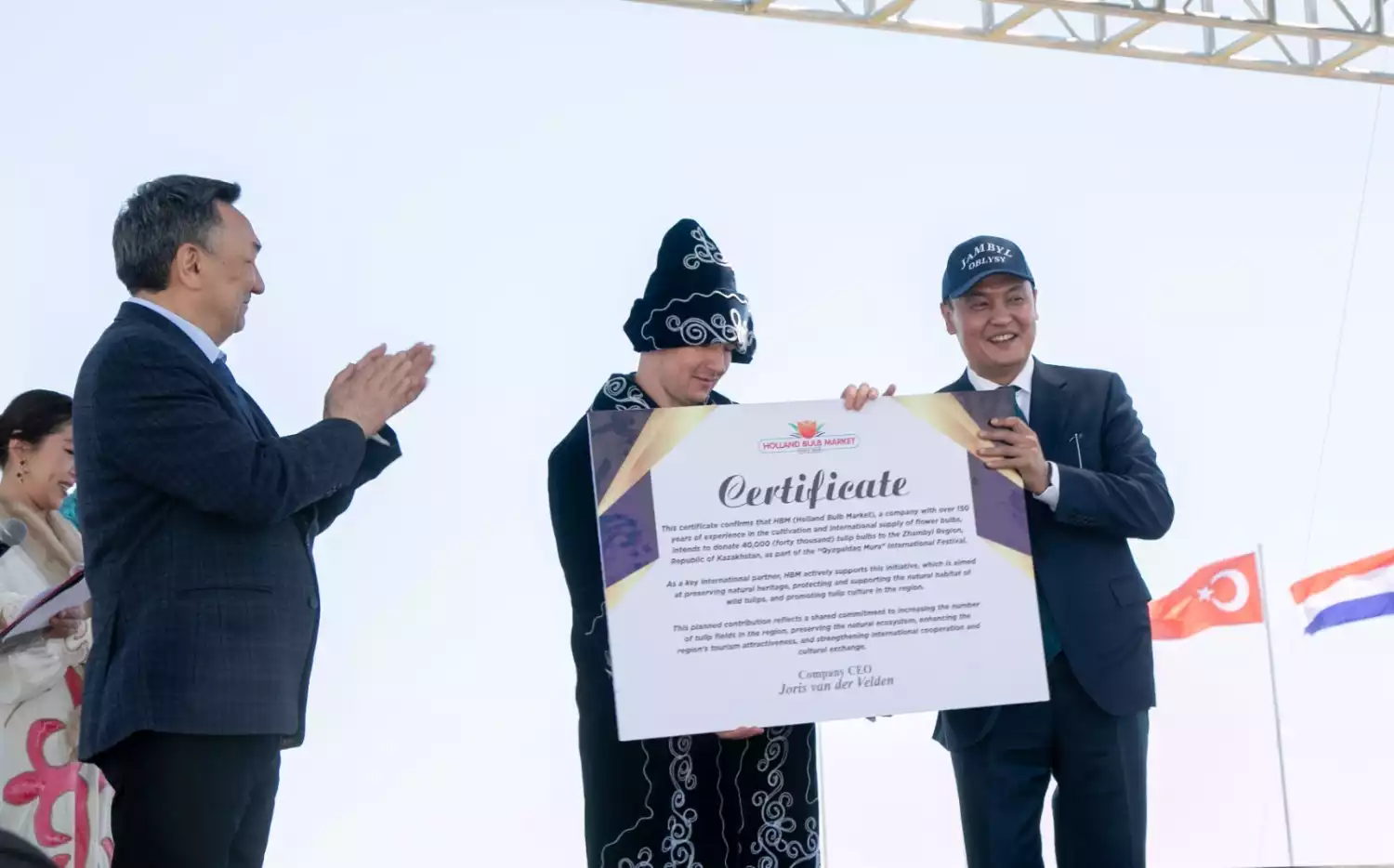 Одним из ярких событий стало торжественное вручение сертификата на 40 тысяч луковиц тюльпанов, доставленных в Жамбылскую область из Нидерландов. Зарубежный гость поделился впечатлениями о фестивале и рассказал об истории голландских тюльпанов.